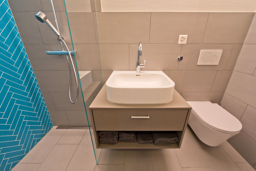 Neugestaltung eines kleinen Badezimmers. Dusche mit Rückwand im Fischgratmuster. Badezimmermöbel aus Fenix und Becken aus Corian.